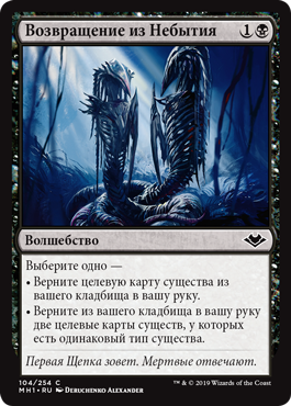 | Rules | Choose one — • Return target creature card from your graveyard to your hand. • Return two target creature cards that share a creature type from your graveyard to your hand. |