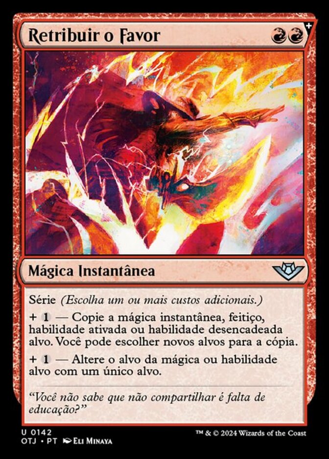 | Rules | Spree (Choose one or more additional costs.) + — Copy target instant spell, sorcery spell, activated ability, or triggered ability. You may choose new targets for the copy. + — Change the target of target spell or ability with a single target. |