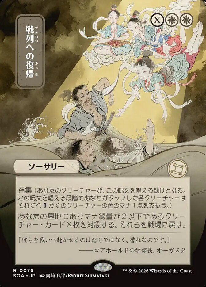 | Rules | Convoke (Your creatures can help cast this spell. Each creature you tap while casting this spell pays for or one mana of that creature's color.) Return X target creature cards with mana value 2 or less from your graveyard to the battlefield. |