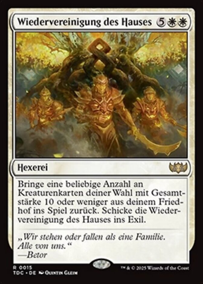 | Rules | Return any number of target creature cards with total power 10 or less from your graveyard to the battlefield. Exile Reunion of the House. |