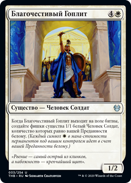 | Rules | When Reverent Hoplite enters the battlefield, create a number of 1/1 white Human Soldier creature tokens equal to your devotion to white. (Each in the mana costs of permanents you control counts toward your devotion to white.) |
