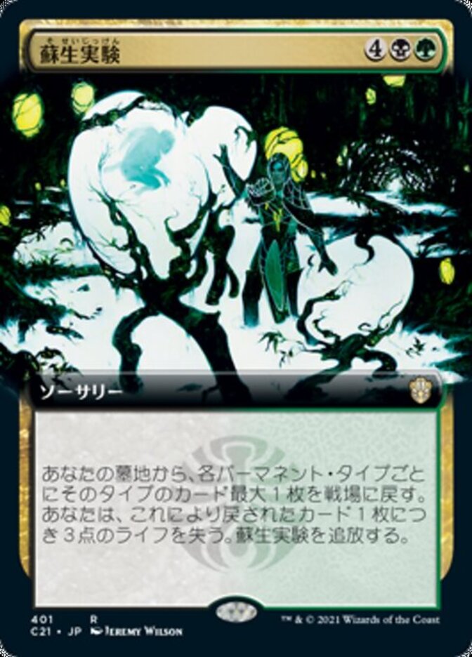 | Rules | For each permanent type, return up to one card of that type from your graveyard to the battlefield. You lose 3 life for each card returned this way. Exile Revival Experiment. |