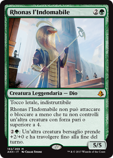 | Rules | Deathtouch, indestructible Rhonas the Indomitable can't attack or block unless you control another creature with power 4 or greater. : Another target creature gets +2/+0 and gains trample until end of turn. |