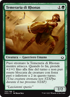 | Rules | You may exert Rhonas's Stalwart as it attacks. When you do, it gets +1/+1 until end of turn and can't be blocked by creatures with power 2 or less this turn. (An exerted creature won't untap during your next untap step.) |