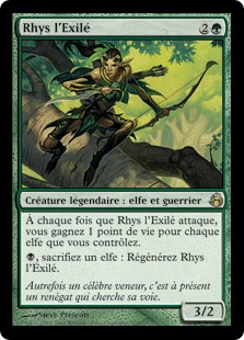 | Rules | Whenever Rhys the Exiled attacks, you gain 1 life for each Elf you control. , Sacrifice an Elf: Regenerate Rhys the Exiled. |