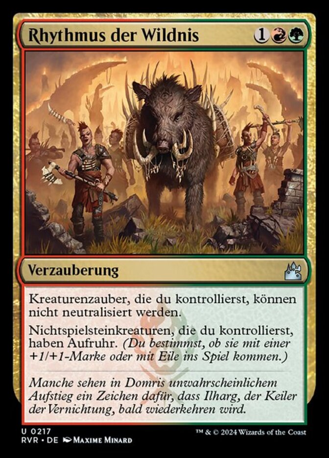 | Rules | Creature spells you control can't be countered. Nontoken creatures you control have riot. (They enter the battlefield with your choice of a +1/+1 counter or haste.) |
