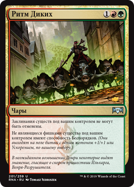 | Rules | Creature spells you control can't be countered. Nontoken creatures you control have riot. (They enter the battlefield with your choice of a +1/+1 counter or haste.) |