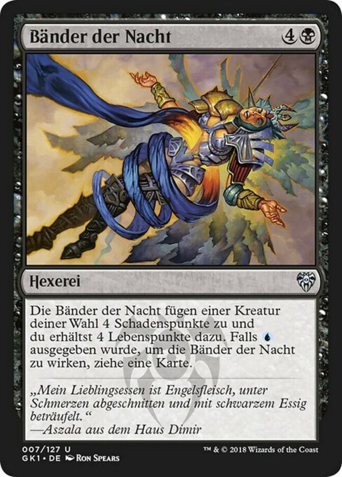 | Rules | Ribbons of Night deals 4 damage to target creature and you gain 4 life. If was spent to cast this spell, draw a card. |