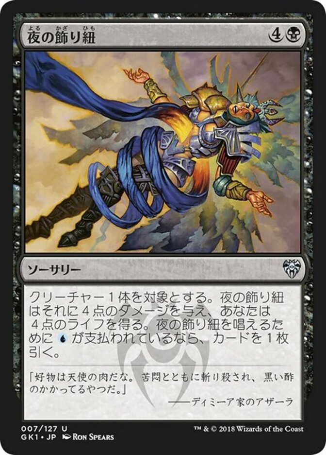 | Rules | Ribbons of Night deals 4 damage to target creature and you gain 4 life. If was spent to cast this spell, draw a card. |