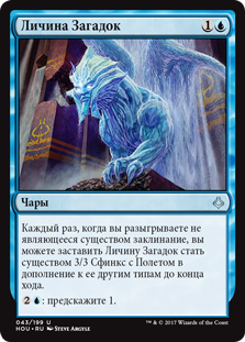 | Rules | Whenever you cast a noncreature spell, you may have Riddleform become a 3/3 Sphinx creature with flying in addition to its other types until end of turn. : Scry 1. (Look at the top card of your library. You may put that card on the bottom of your library.) |