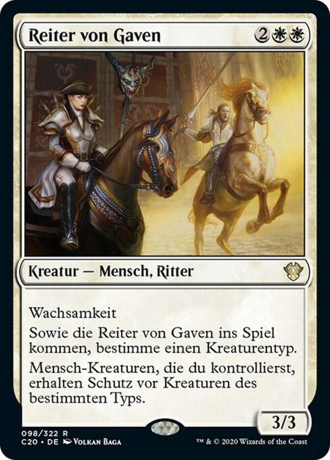 | Rules | Vigilance As Riders of Gavony enters the battlefield, choose a creature type. Human creatures you control have protection from creatures of the chosen type. |