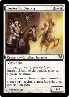 | Rules | Vigilance As Riders of Gavony enters the battlefield, choose a creature type. Human creatures you control have protection from creatures of the chosen type. |
