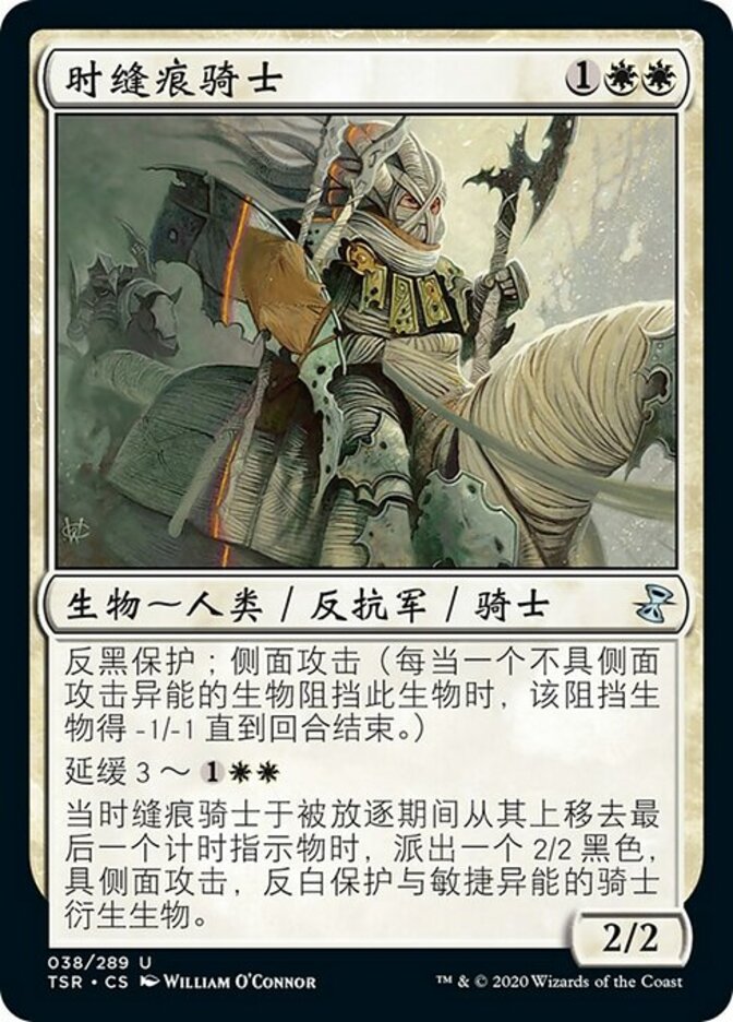 | Rules | Protection from black; flanking (Whenever a creature without flanking blocks this creature, the blocking creature gets -1/-1 until end of turn.) Suspend 3— When the last time counter is removed from Riftmarked Knight while it's exiled, create a 2/2 black Knight creature token with flanking, protection from white, and haste. |