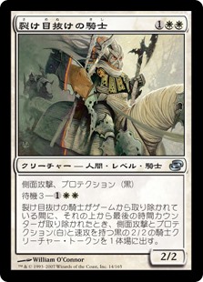 | Rules | Protection from black; flanking (Whenever a creature without flanking blocks this creature, the blocking creature gets -1/-1 until end of turn.) Suspend 3— When the last time counter is removed from Riftmarked Knight while it's exiled, create a 2/2 black Knight creature token with flanking, protection from white, and haste. |