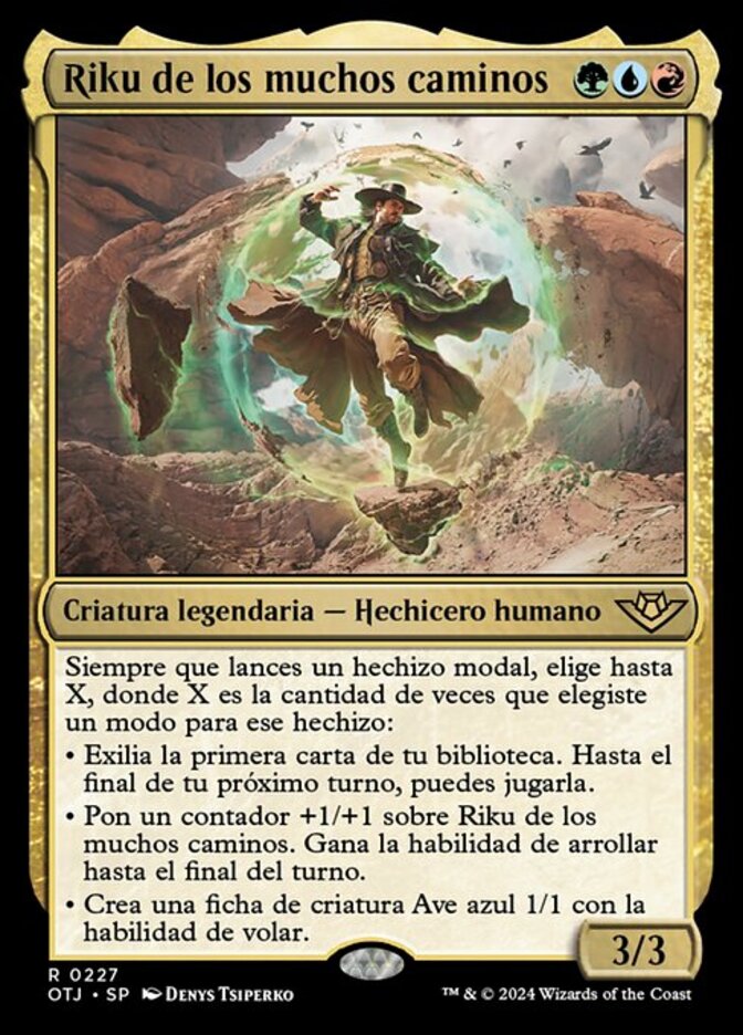 | Rules | Whenever you cast a modal spell, choose up to X, where X is the number of times you chose a mode for that spell — • Exile the top card of your library. Until the end of your next turn, you may play it. • Put a +1/+1 counter on Riku of Many Paths. It gains trample until end of turn. • Create a 1/1 blue Bird creature token with flying. |