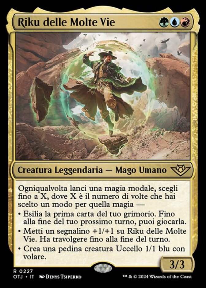 | Rules | Whenever you cast a modal spell, choose up to X, where X is the number of times you chose a mode for that spell — • Exile the top card of your library. Until the end of your next turn, you may play it. • Put a +1/+1 counter on Riku of Many Paths. It gains trample until end of turn. • Create a 1/1 blue Bird creature token with flying. |