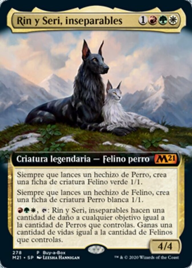 | Rules | Whenever you cast a Dog spell, create a 1/1 green Cat creature token. Whenever you cast a Cat spell, create a 1/1 white Dog creature token. , : Rin and Seri, Inseparable deals damage to any target equal to the number of Dogs you control. You gain life equal to the number of Cats you control. |