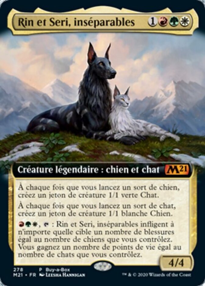 | Rules | Whenever you cast a Dog spell, create a 1/1 green Cat creature token. Whenever you cast a Cat spell, create a 1/1 white Dog creature token. , : Rin and Seri, Inseparable deals damage to any target equal to the number of Dogs you control. You gain life equal to the number of Cats you control. |