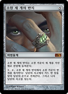 | Rules | Ring of Three Wishes enters the battlefield with three wish counters on it. , , Remove a wish counter from Ring of Three Wishes: Search your library for a card, put that card into your hand, then shuffle. |