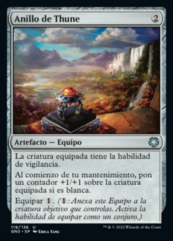 | Rules | Equipped creature has vigilance. (Attacking doesn't cause it to tap.) At the beginning of your upkeep, put a +1/+1 counter on equipped creature if it's white. Equip (: Attach to target creature you control. Equip only as a sorcery.) |