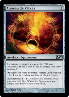 | Rules | Equipped creature has haste. (It can attack and no matter when it came under your control.) At the beginning of your upkeep, put a +1/+1 counter on equipped creature if it's red. Equip (: Attach to target creature you control. Equip only as a sorcery.) |