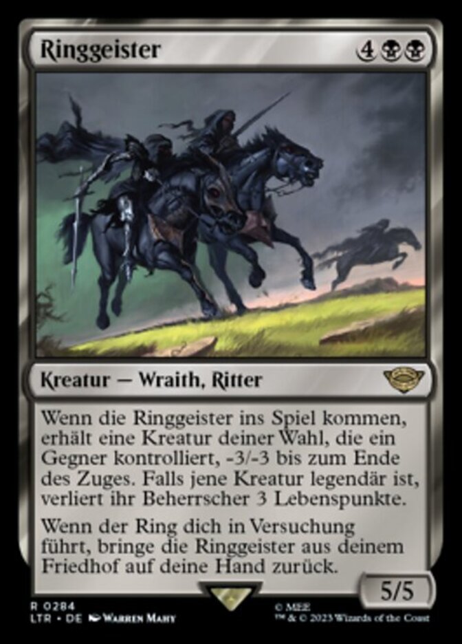 | Rules | When Ringwraiths enters the battlefield, target creature an opponent controls gets -3/-3 until end of turn. If that creature is legendary, its controller loses 3 life. When the Ring tempts you, return Ringwraiths from your graveyard to your hand. |