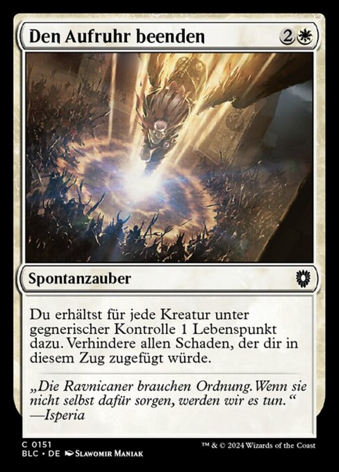 | Rules | You gain 1 life for each creature your opponents control. Prevent all damage that would be dealt to you this turn. |