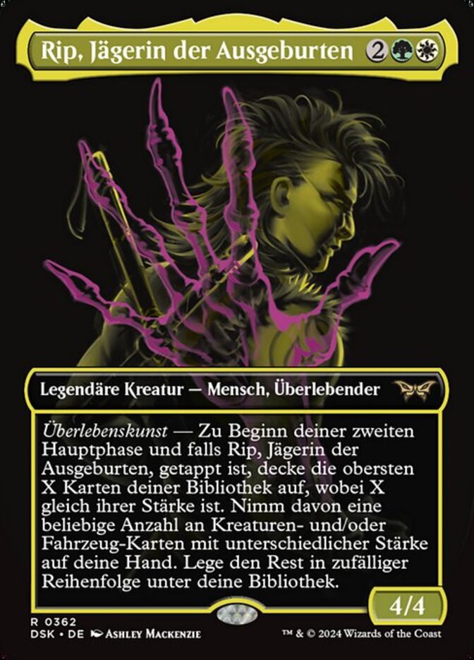| Rules | Survival — At the beginning of your second main phase, if Rip, Spawn Hunter is tapped, reveal the top X cards of your library, where X is its power. Put any number of creature and/or Vehicle cards with different powers from among them into your hand. Put the rest on the bottom of your library in a random order. |