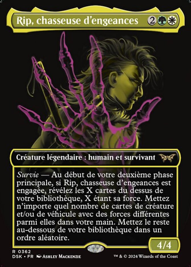 | Rules | Survival — At the beginning of your second main phase, if Rip, Spawn Hunter is tapped, reveal the top X cards of your library, where X is its power. Put any number of creature and/or Vehicle cards with different powers from among them into your hand. Put the rest on the bottom of your library in a random order. |