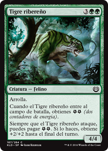 | Rules | Trample When Riparian Tiger enters the battlefield, you get (two energy counters). Whenever Riparian Tiger attacks, you may pay . If you do, it gets +2/+2 until end of turn. |