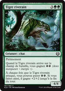 | Rules | Trample When Riparian Tiger enters the battlefield, you get (two energy counters). Whenever Riparian Tiger attacks, you may pay . If you do, it gets +2/+2 until end of turn. |