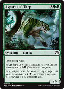 | Rules | Trample When Riparian Tiger enters the battlefield, you get (two energy counters). Whenever Riparian Tiger attacks, you may pay . If you do, it gets +2/+2 until end of turn. |