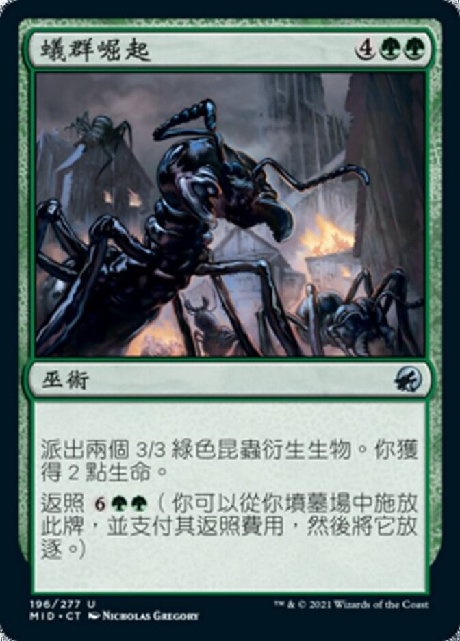 | Rules | Create two 3/3 green Insect creature tokens. You gain 2 life. Flashback (You may cast this card from your graveyard for its flashback cost. Then exile it.) |