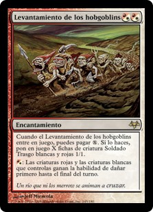 | Rules | When Rise of the Hobgoblins enters the battlefield, you may pay . If you do, create X 1/1 red and white Goblin Soldier creature tokens. : Red creatures and white creatures you control gain first strike until end of turn. |