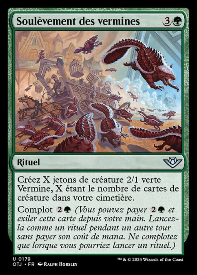 | Rules | Create X 2/1 green Varmint creature tokens, where X is the number of creature cards in your graveyard. Plot (You may pay and exile this card from your hand. Cast it as a sorcery on a later turn without paying its mana cost. Plot only as a sorcery.) |
