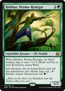 | Rules | When Rishkar, Peema Renegade enters the battlefield, put a +1/+1 counter on each of up to two target creatures. Each creature you control with a counter on it has ": Add ." |