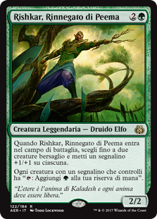 | Rules | When Rishkar, Peema Renegade enters the battlefield, put a +1/+1 counter on each of up to two target creatures. Each creature you control with a counter on it has ": Add ." |