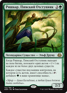 | Rules | When Rishkar, Peema Renegade enters the battlefield, put a +1/+1 counter on each of up to two target creatures. Each creature you control with a counter on it has ": Add ." |