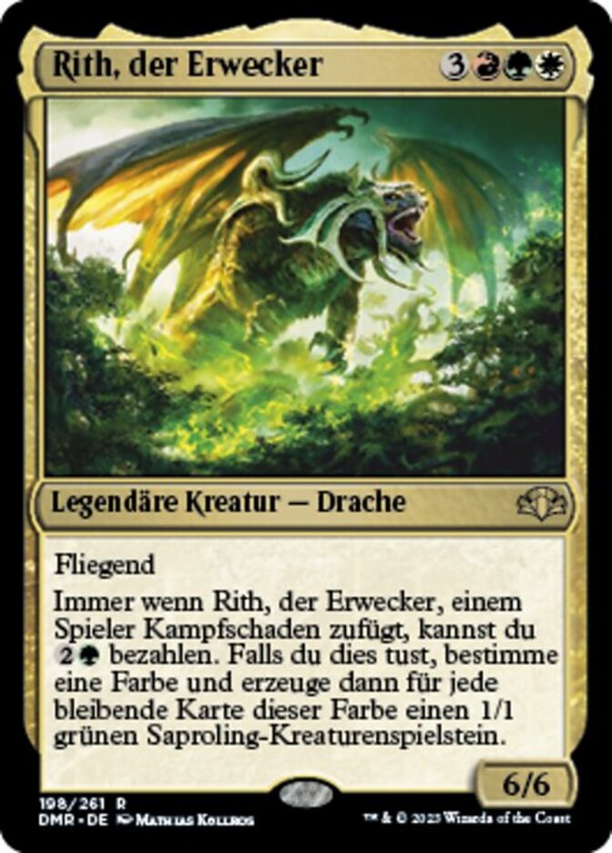 | Rules | Flying Whenever Rith, the Awakener deals combat damage to a player, you may pay . If you do, choose a color, then create a 1/1 green Saproling creature token for each permanent of that color. |