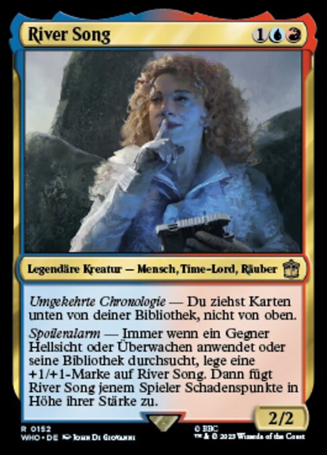 Spoilers — Whenever an opponent scries, surveils, or searches their library, put a +1/+1 counter on River Song. Then River Song deals damage to that player equal to its power.