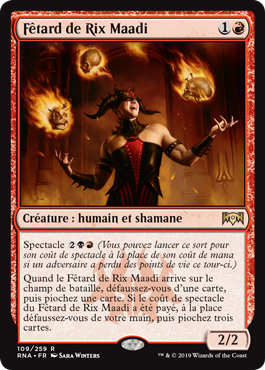 | Rules | Spectacle (You may cast this spell for its spectacle cost rather than its mana cost if an opponent lost life this turn.) When Rix Maadi Reveler enters the battlefield, discard a card, then draw a card. If Rix Maadi Reveler's spectacle cost was paid, instead discard your hand, then draw three cards. |