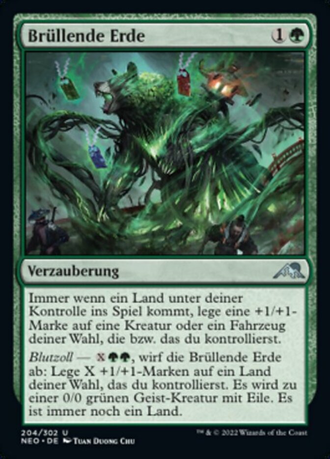 | Rules | Whenever a land enters the battlefield under your control, put a +1/+1 counter on target creature or Vehicle you control. Channel — , Discard Roaring Earth: Put X +1/+1 counters on target land you control. It becomes a 0/0 green Spirit creature with haste. It's still a land. |