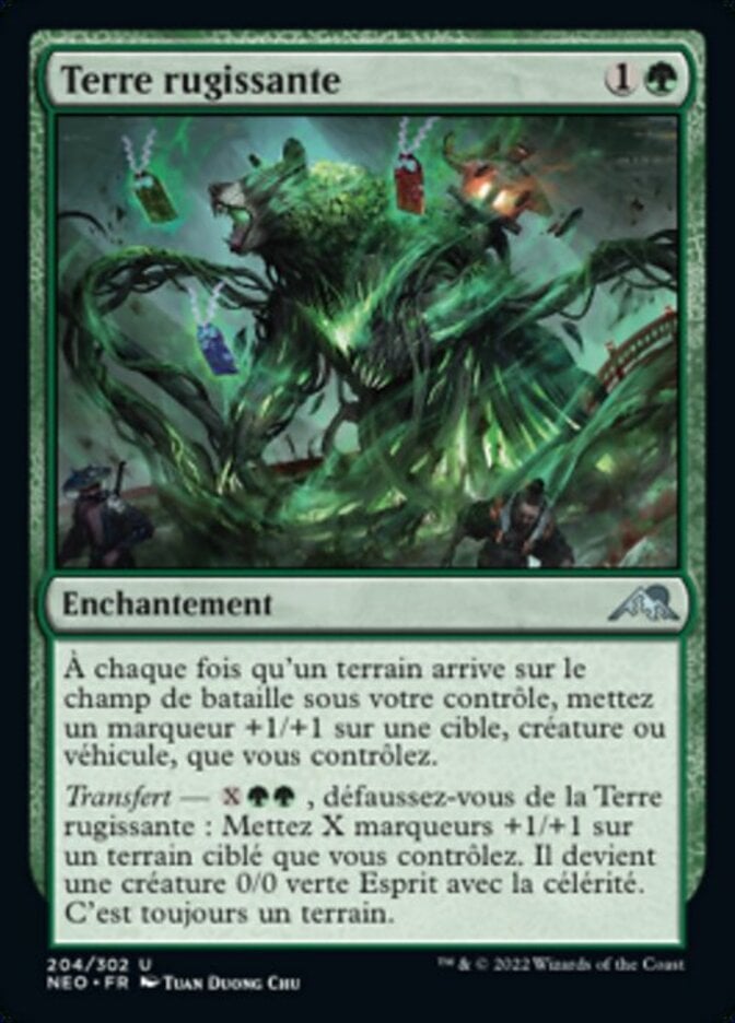 | Rules | Whenever a land enters the battlefield under your control, put a +1/+1 counter on target creature or Vehicle you control. Channel — , Discard Roaring Earth: Put X +1/+1 counters on target land you control. It becomes a 0/0 green Spirit creature with haste. It's still a land. |