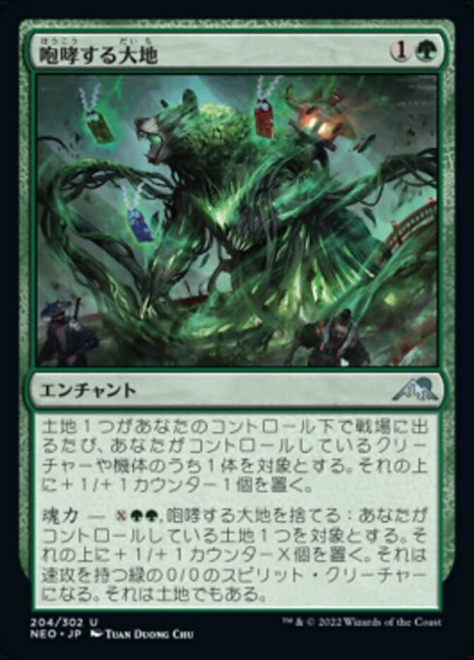 | Rules | Whenever a land enters the battlefield under your control, put a +1/+1 counter on target creature or Vehicle you control. Channel — , Discard Roaring Earth: Put X +1/+1 counters on target land you control. It becomes a 0/0 green Spirit creature with haste. It's still a land. |