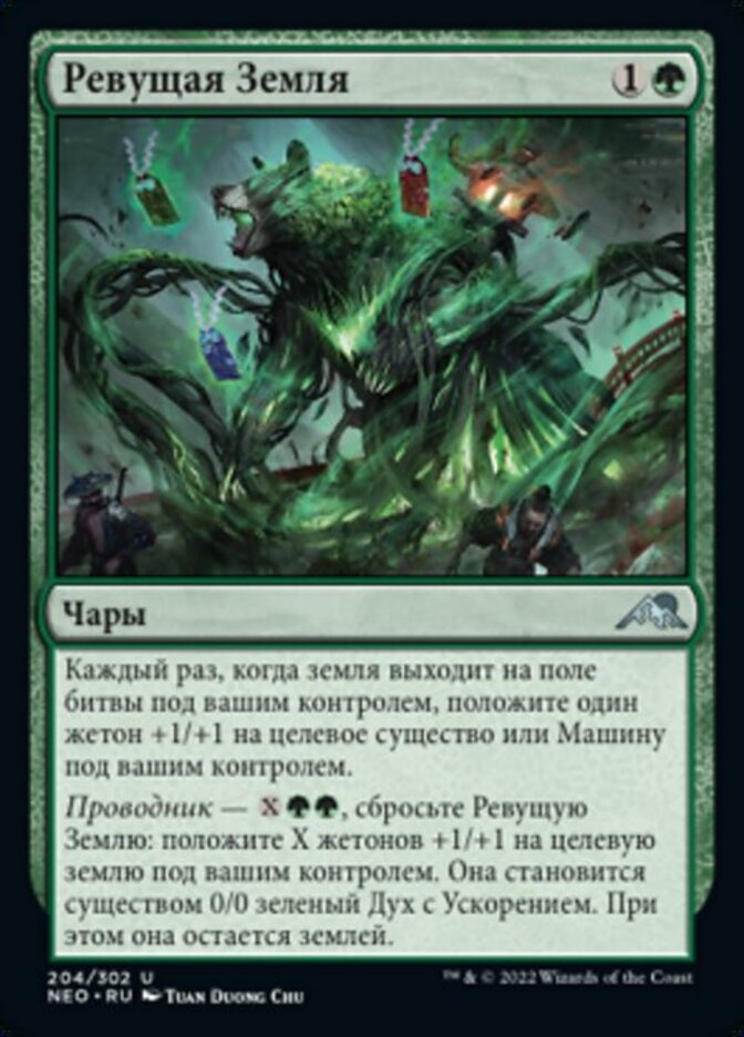 | Rules | Whenever a land enters the battlefield under your control, put a +1/+1 counter on target creature or Vehicle you control. Channel — , Discard Roaring Earth: Put X +1/+1 counters on target land you control. It becomes a 0/0 green Spirit creature with haste. It's still a land. |