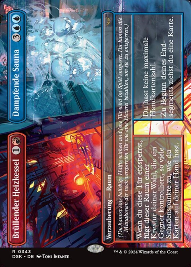 | Rules | (You may cast either half. That door unlocks on the battlefield. As a sorcery, you may pay the mana cost of a locked door to unlock it.) When you unlock this door, this Room deals damage equal to the number of cards in your hand to target creature an opponent controls. // (You may cast either half. That door unlocks on the battlefield. As a sorcery, you may pay the mana cost of a locked door to unlock it.) You have no maximum hand size. At the beginning of your end step, draw a card. |