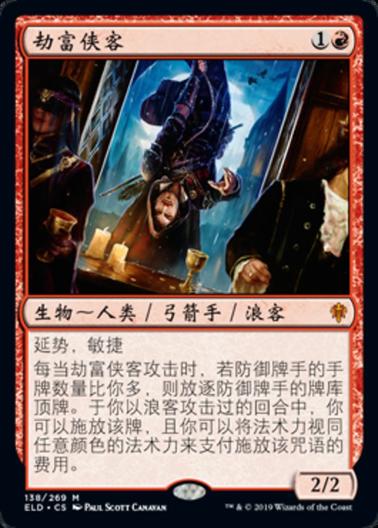 | Rules | Reach, haste Whenever Robber of the Rich attacks, if defending player has more cards in hand than you, exile the top card of their library. During any turn you attacked with a Rogue, you may cast that card and you may spend mana as though it were mana of any color to cast that spell. |