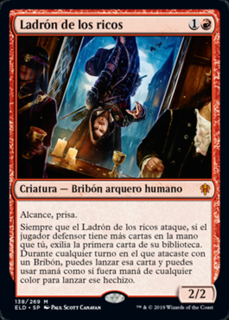 | Rules | Reach, haste Whenever Robber of the Rich attacks, if defending player has more cards in hand than you, exile the top card of their library. During any turn you attacked with a Rogue, you may cast that card and you may spend mana as though it were mana of any color to cast that spell. |