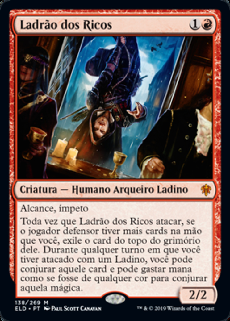 | Rules | Reach, haste Whenever Robber of the Rich attacks, if defending player has more cards in hand than you, exile the top card of their library. During any turn you attacked with a Rogue, you may cast that card and you may spend mana as though it were mana of any color to cast that spell. |
