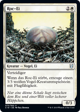 | Rules | Defender (This creature can't attack.) When Roc Egg dies, create a 3/3 white Bird creature token with flying. |